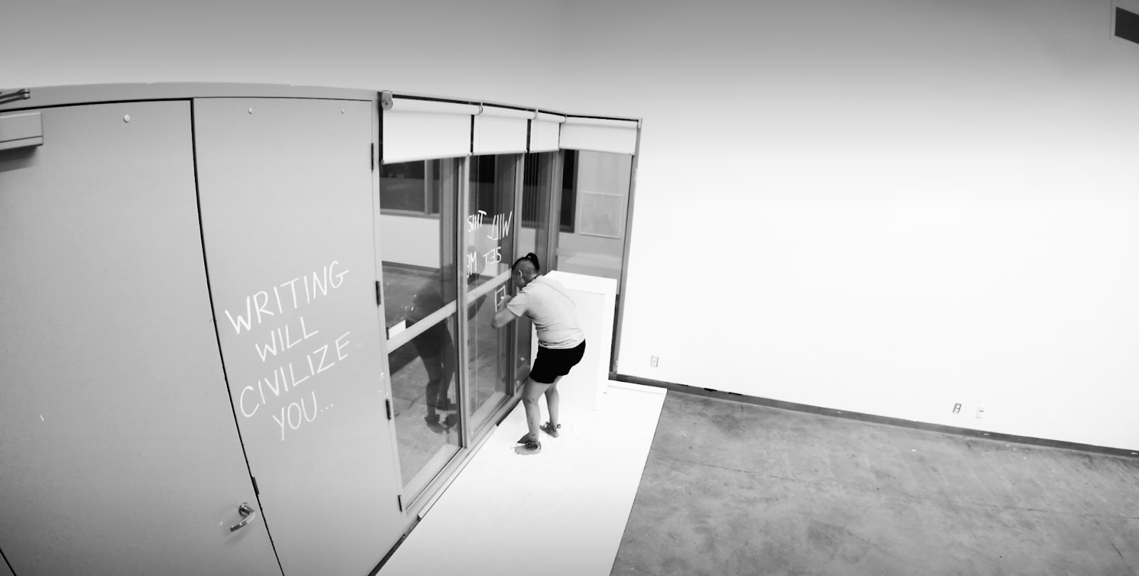 C1260 is a single take, black and white video and improvised performance piece featuring RED—a curious Contrary Windigokan character as they dance backwards into the constraints of a colonial institution. An alter-ego whose gifts allow them to teleport, time travel and to regenerate, is an expression of the artists struggle to adhere to colonial expectations held by institutions.