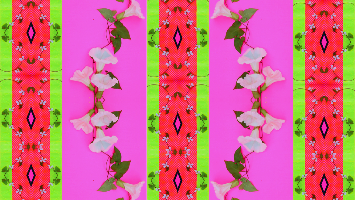 Utilizing hyper-camp floral blooms, untamed weeds and neon surfaces, these recalled wallpaper patterns collide the organic with the manufactured in order to create wildly femme motifs that explore gender, power and class within the domestic realm. Dandelions, ivy and morning glory are combined with the vivid gloss of construction tape, neon fencing and industrial paint and woven into a series of unfixed collages. Documented in the wind, these compositions tremor with a subtle movement somewhere between the animate and the inanimate, growth and collapse.