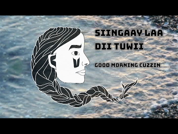 I made this piece to share a little of what I’ve been learning of Xaad kil, the Aw Tlagee (Masset) dialect of the Haida language. Opening with a video of the ocean from Aw Tlagee, a robot and a self portrait have a basic conversation in the language. The characters’ faces become mirrored and distorted throughout the conversation, similarly the background video becomes more distorted, cubed, reflected over time. The increased distortion of the images throughout the video is a reflection of my personal experience with the complexity of communication. The images appear on a phone screen, referencing the increased need for digital communication recently, I have had this exact conversation with a lot of people now. The same conversation is repeated multiple times in the video, this is how we learn our languages- with repetition from multiple contexts over time. I’m still learning my language, and I want to share with you. In my learning we’ve focused on speaking, not writing, therefore I’ve written how I would speak– there will be spelling errors, missing accent markers and special characters.