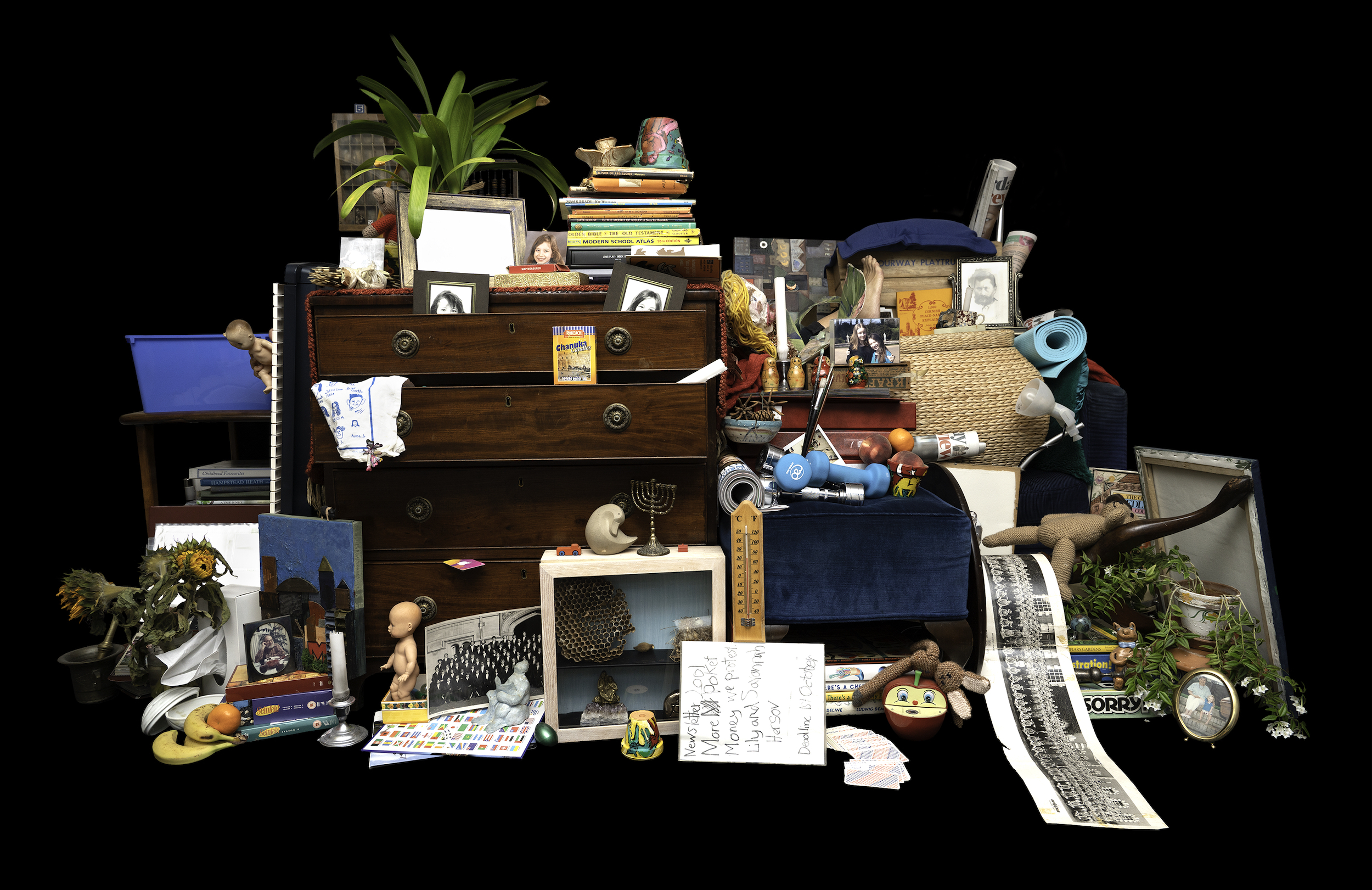 While the physical environment that the person lives in is concealed, the shape of the object sculpture is quietly dictated by the walls and arrangement of the room. The portraits mimic the aesthetic of a garage sale or the stacked objects of a moving day. These images hint at the transience of objects and the ways in which people and things move (at will or not) in and out of spaces.