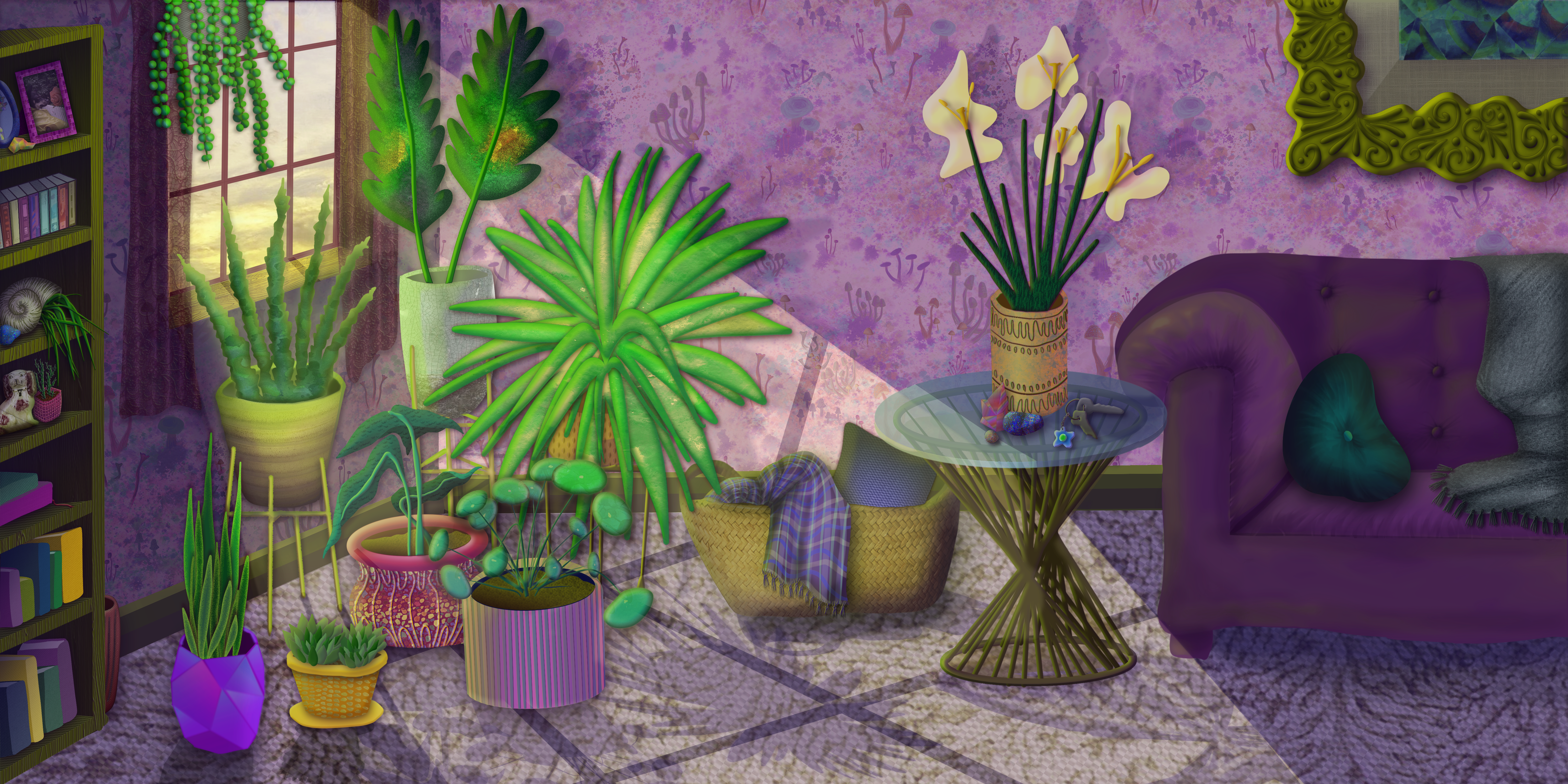 Morning Light Dance depicts the passage of time in an interior space, the lack of figures shows the isolation one feels when chronically ill, but the play of the lights and the view out of the window represent disabled joy and beauty found in slowing down and observing small moments.