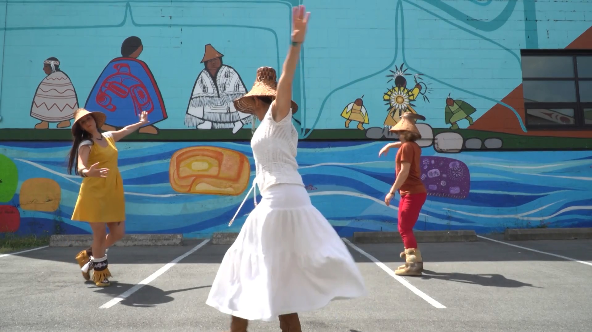 The mural of the dancers at Native Education College, Vancouver, was the inspiration for this film. The colours and movement inspired the idea of dancers in cedar hats coming together as a community but maintaining their individual identities. The song is an arrangement based on Welcome Song by the Tiqilap community singers. This video calls forth the traditions, diversity, and colours of our community and urges them to thrive despite the greyness and unforgiving concrete.